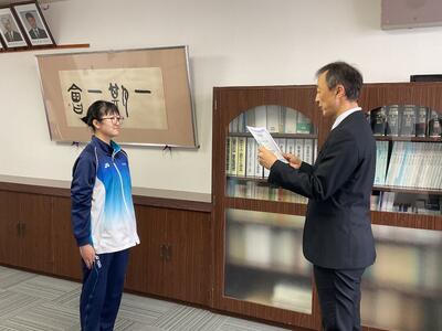 先日行われた全道英語暗唱大会で5位入賞を果たした2年久保田さんの表彰式を校長室にて行いました。