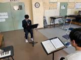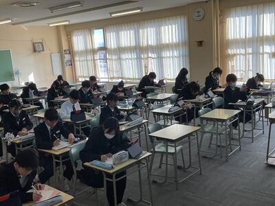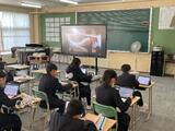 2年生の教室から遠藤光Tと塩俵Tの両担任のもと、各家庭にいる生徒に向けてメッセージを送りました。